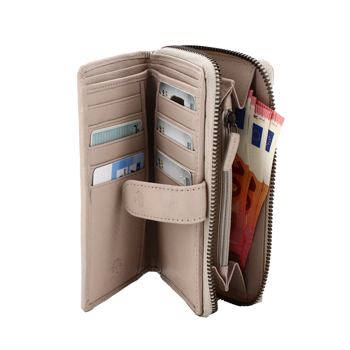 Reißverschluss-Fach mit Zwischenfach für Münzen o.Ä. und weitere Kartenfächer.